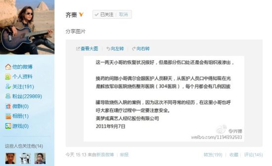 今天(9月7日)距离齐秦因烧伤住院已经第七天,齐秦的经纪公司代齐秦发微博称齐秦现在恢复的很好,只是有部分伤口还有组织液渗出。并呼吁大家以后注意安全。于15点13分齐秦的新浪微博更新了一张图片,图片上是齐秦经纪公司美梦成真艺人经纪股份有限公司发布的声明。(截止到今天15点54分,这条微博已被转发168次,评论127条。)